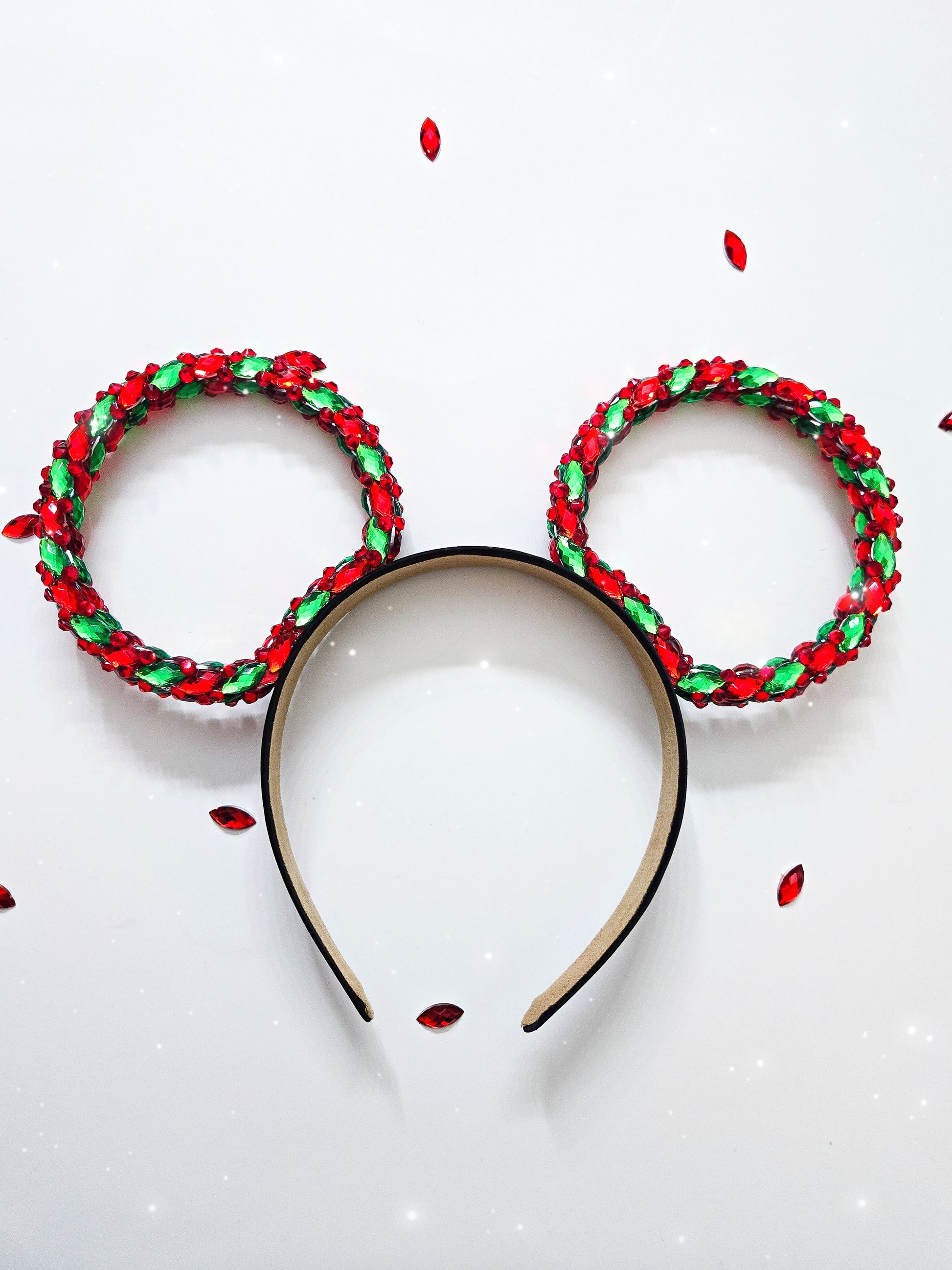 This pair of ears is red with large red and green rhinestones and small red rhinestones . Your choice of no bow or red sequin bow with rhinestones.